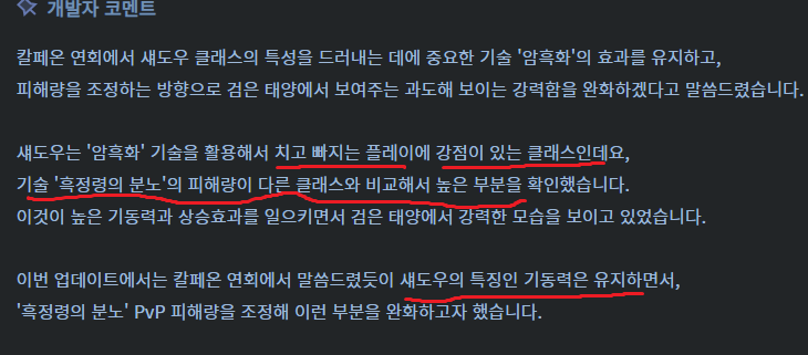 개발자 본인들이 치고 빠지는 플레이에 강점이 있는 클래스라서 흑정궁 시너지 때매 흑정궁 데미지 너프 시키고
