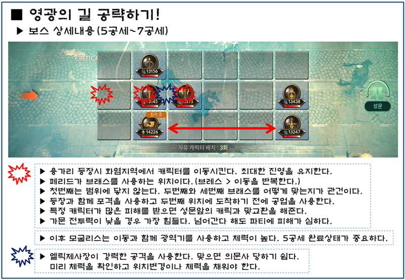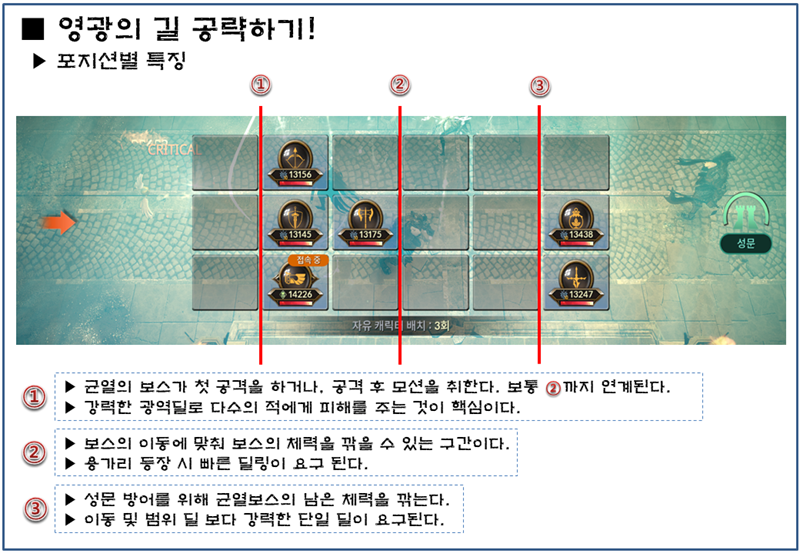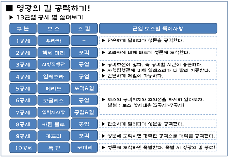 ▶ 영광의 길의 핵심은 공격형 보스 3마리를 어떻게 대처하느냐이다.