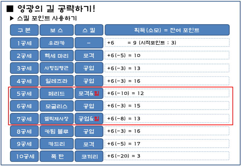 ▶ 스킬은 항상 변수가 있다. 영광의 길을 자주 반복해 보면 본인 스타일이 생긴다.