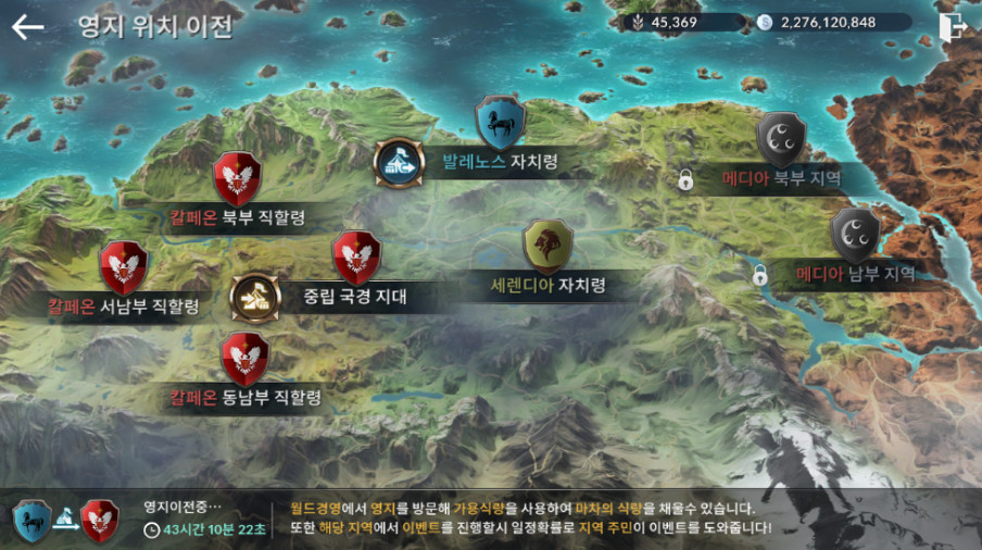 위치 이전할 장소를 선탤할 수 있습니다. 일꾼들과 소비될 재료를 확인후 선택을 하면 이동할 지역에 텐트처럼 생긴 아이콘이 생기면서 이전을 시작합니다. 현재 메디아는 잠겨 있어서 이동이 불가능합니다. 영지이전을 하면 밑에 남은시간이 뜨면서 일꾼들이 영지이동을 준비합니다. 영지이동에 사용된 일꾼은 완료될때까지 채집등에 사용은 되지 않습니다. 저는 43시간정도 남았네요.