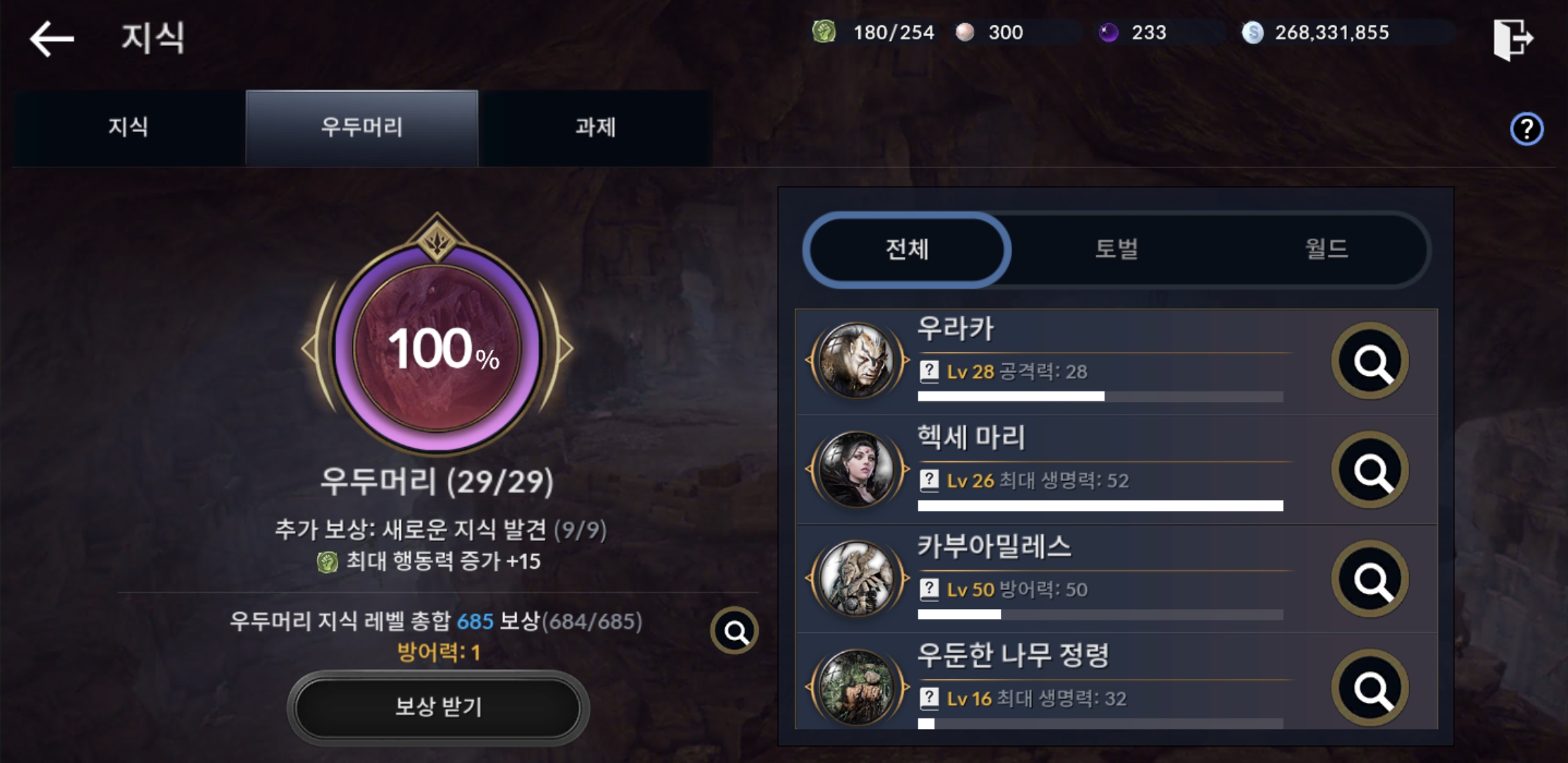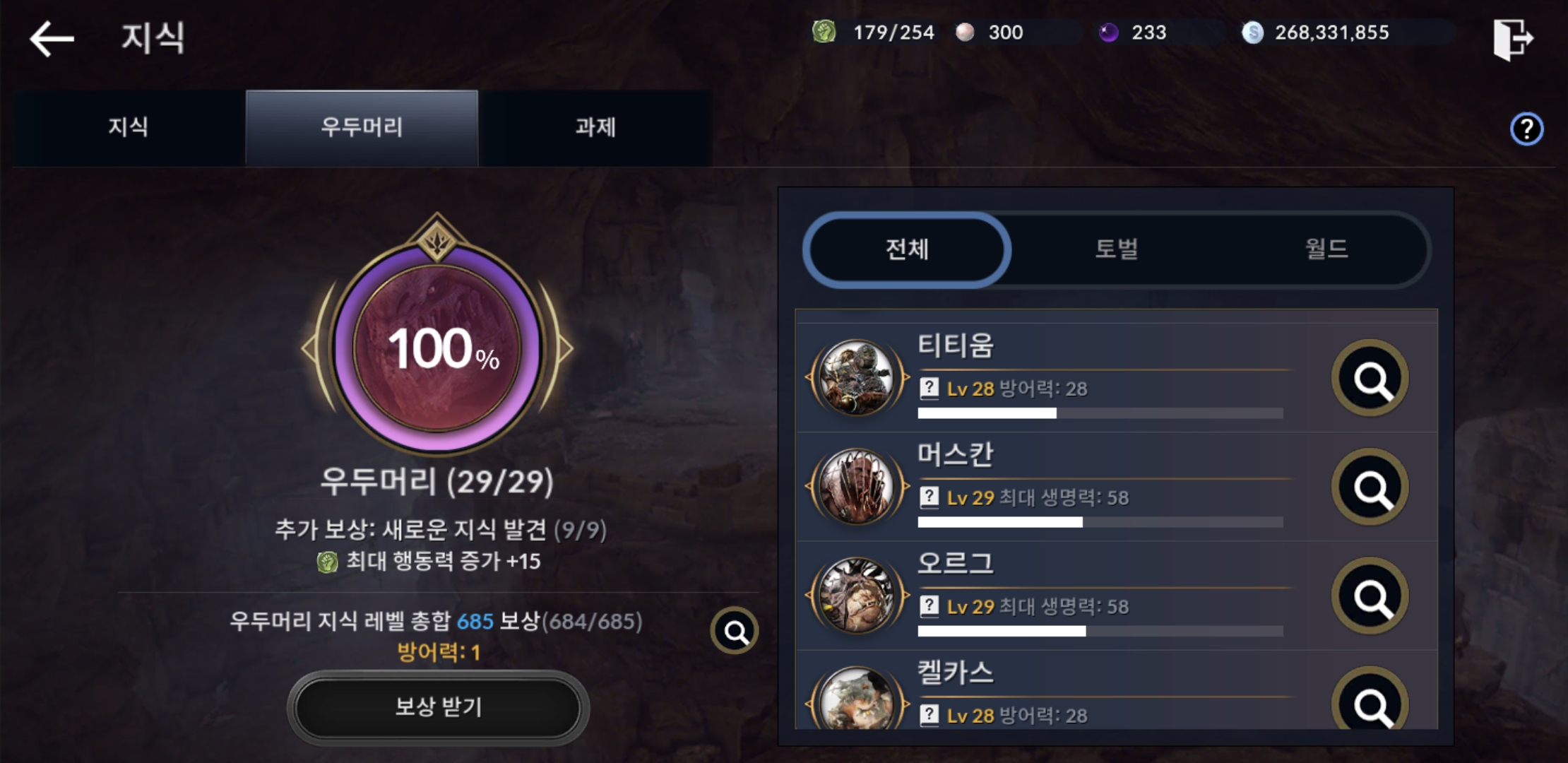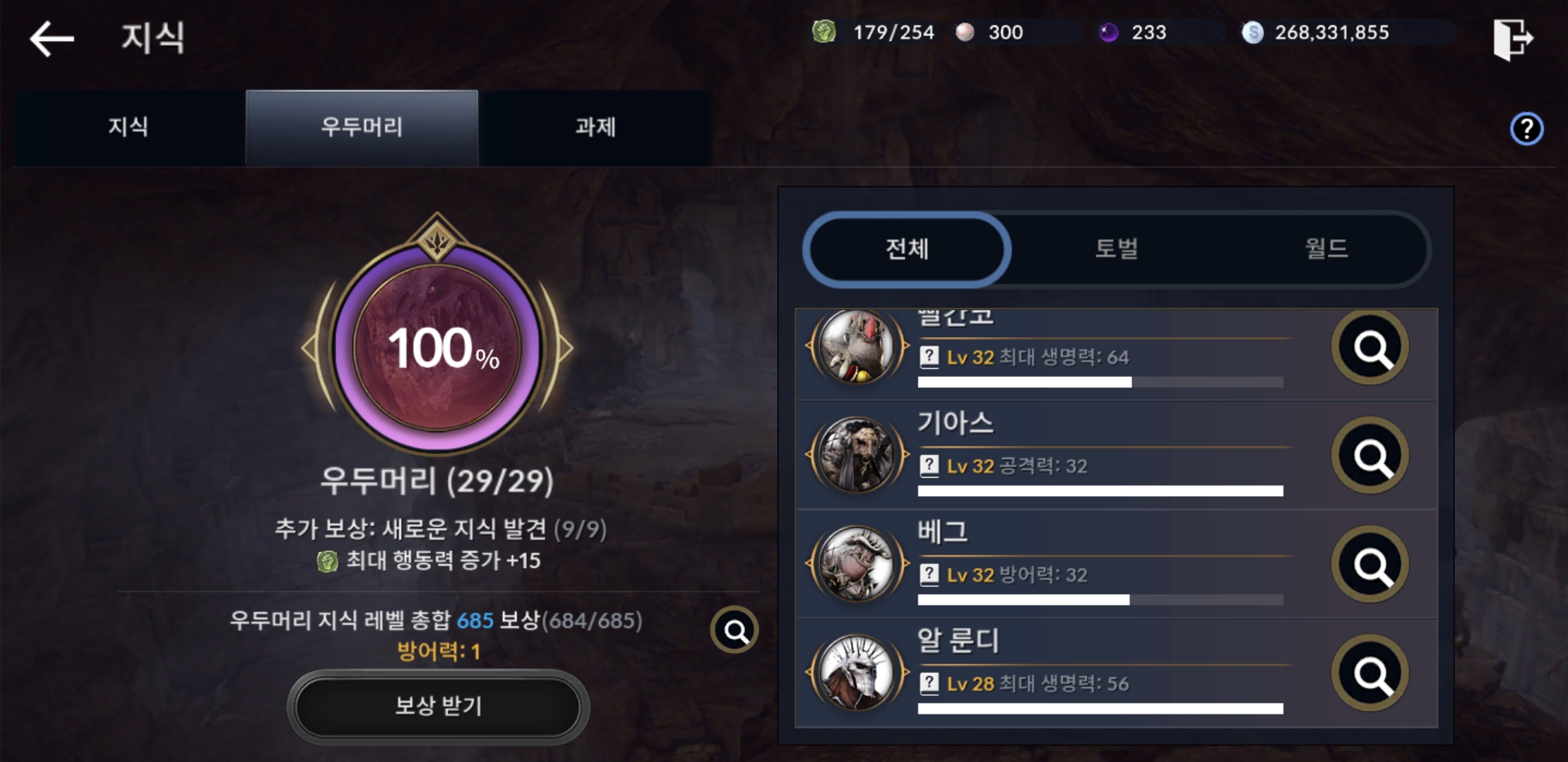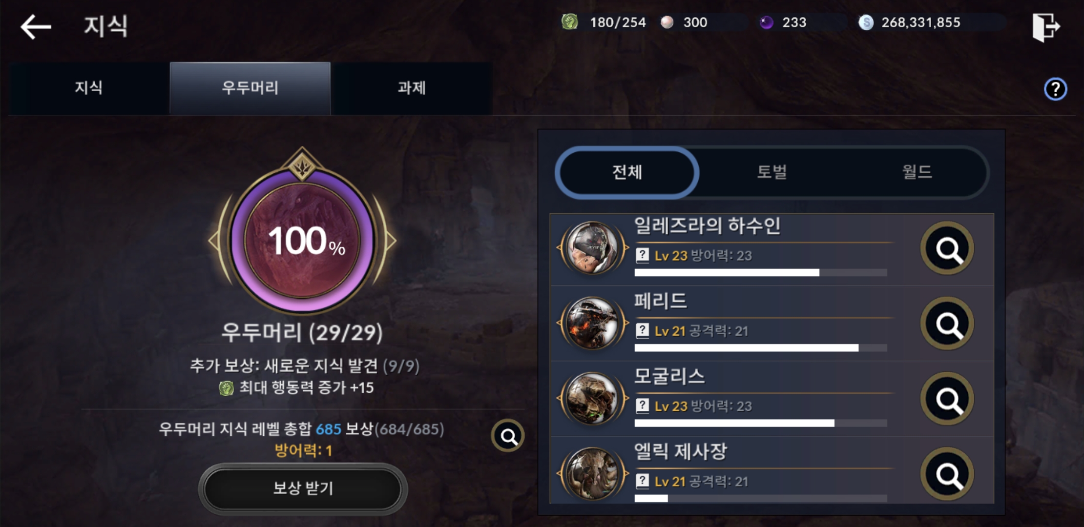 지식에서 방어력, 공격력 올려주는 보스들만 잡아줘도 투력 잘오르고 총합지식도 같이 오르니 투력집중적으로 키우실 분들은 최대생명력인 보스들은 나중에 지식 올리는 식으로 해보세요 ㅎㅎ