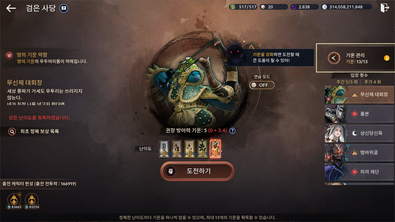 입장 횟수: 매주 5회 (월요일 자정 초기화, '검은 사당 입장권'으로 횟수 추가 가능)