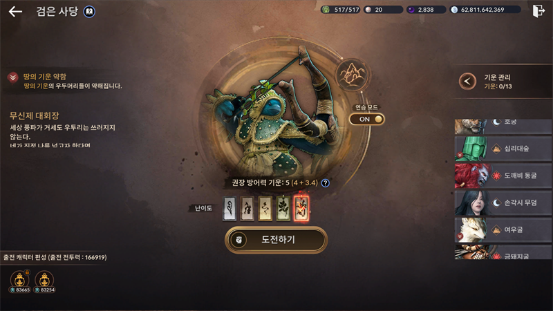 난이도는 가장 낮은 '일재시니'부터 차근차근 도전하며 기운 포인트를 쌓아나가세요.