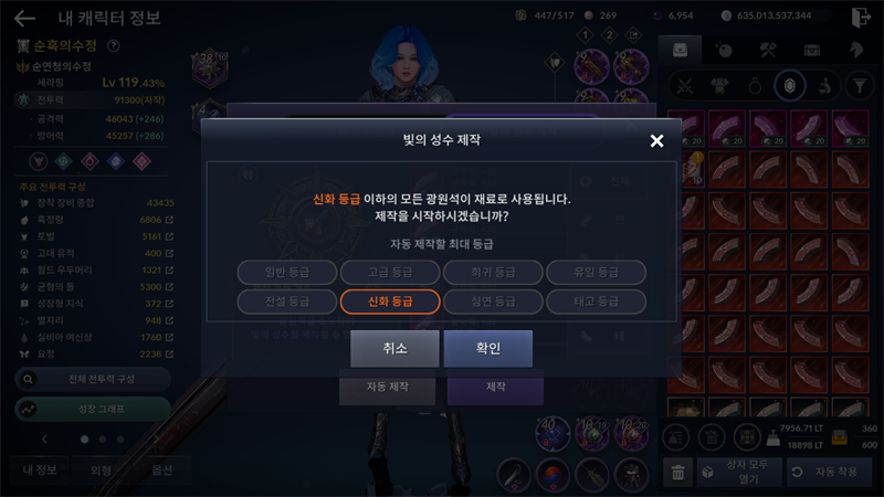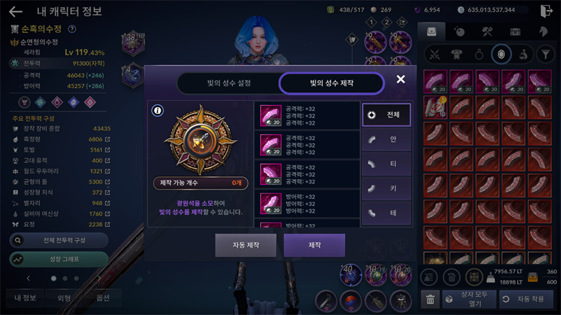 빛의 성수 제작 창에서 '자동 제작'을 누르게 되면