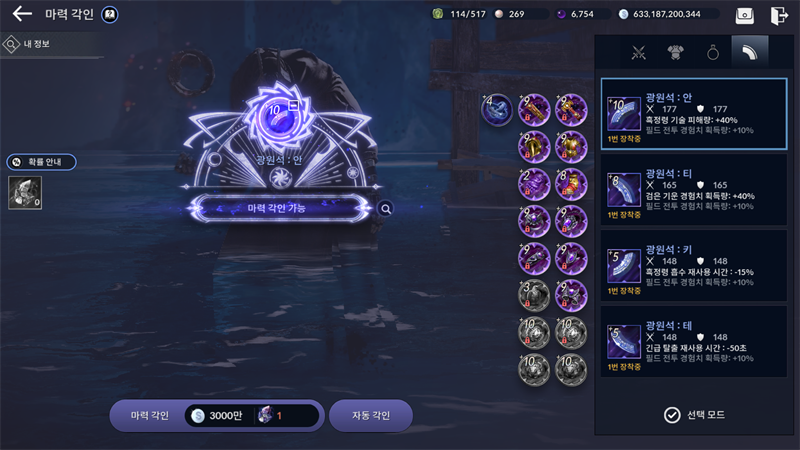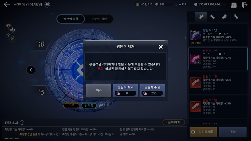 광원석에 장착되어있는 고유 능력과 보조 능력들을 확인할 수 있고