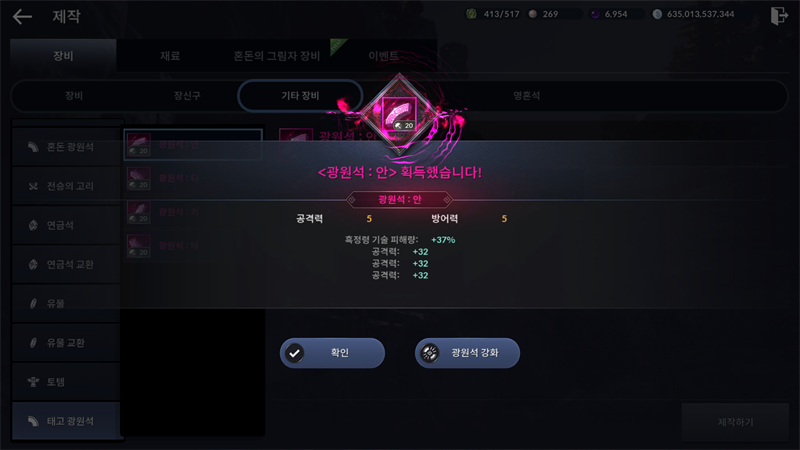 태고급 이상 광원석을 장착 시에는 강화 스택이 적립되어있는 것을 추가로 확인할 수 있습니다.