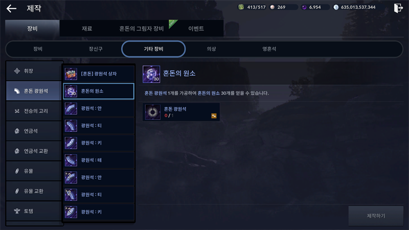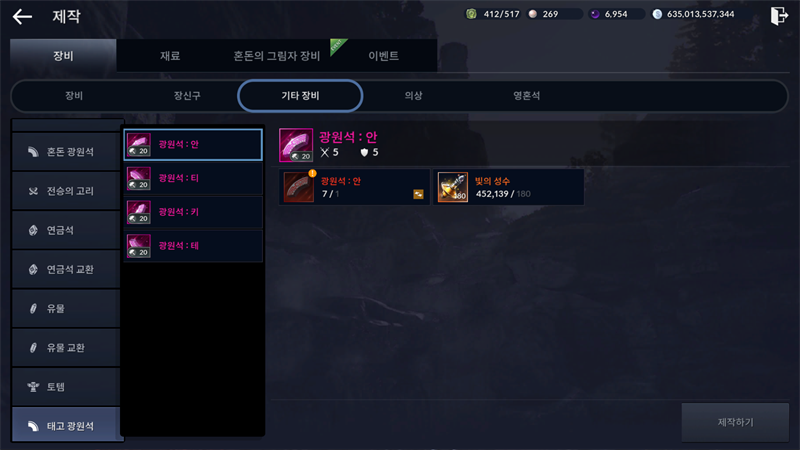 인겜 내에서 메뉴 - 제작 - 기타 장비를 택하면 태고 광원석 또는 혼돈 광원석을 택할수가 있는데