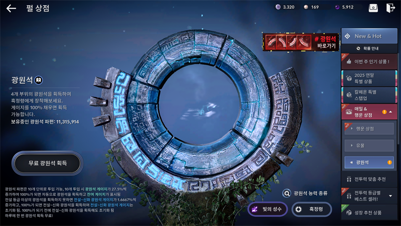 광원석은 매일 밤 12시 때마다 무료로 무작위 등급으로 하나씩 뽑을수가 있습니다.