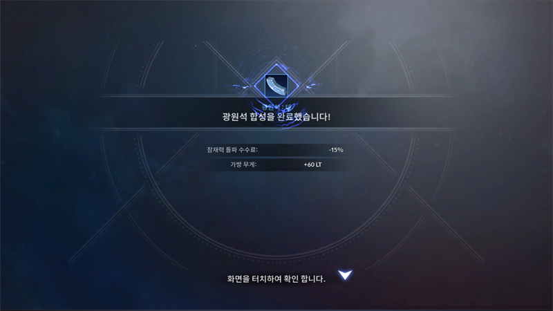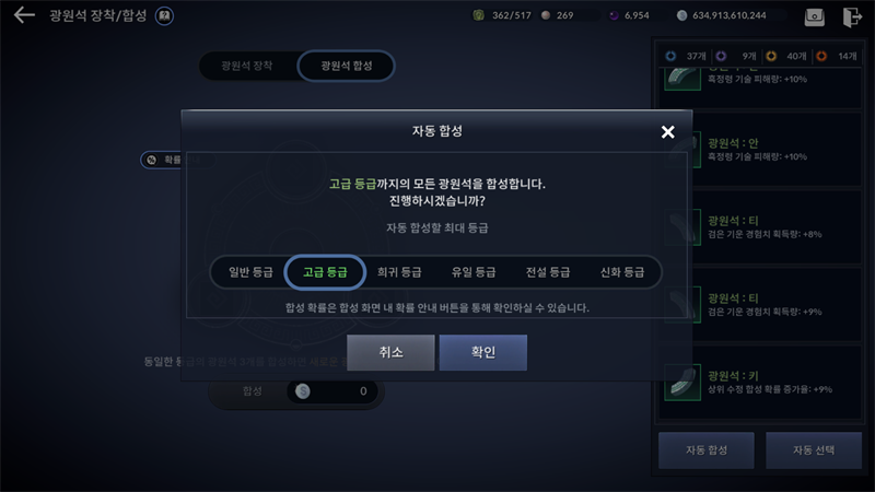 수동 합성법의 경우 동일 등급의 광원석 세개를 터치하고 '합성'을 누르면