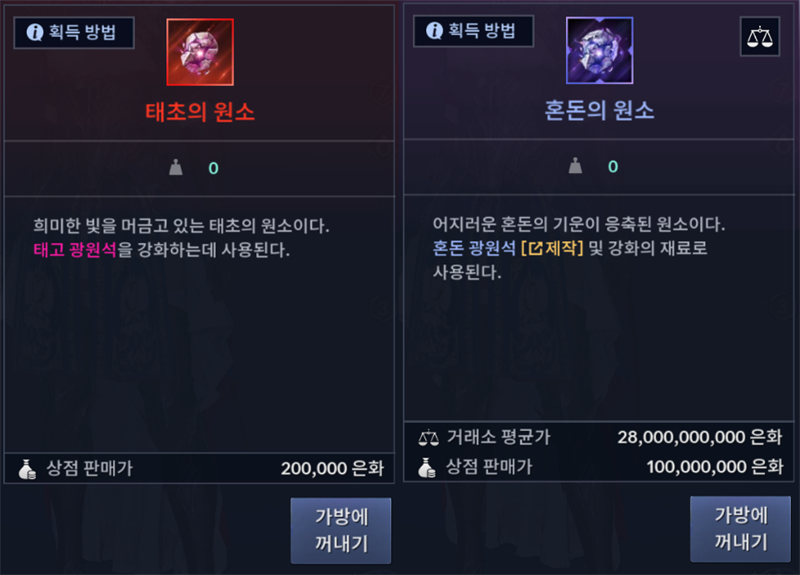 여기서 태초의 원소의 경우 태고급 광원석을 강화할 수가 있고 혼돈의 원소의 경우 혼돈급 광원석을 강화할 수가 있습니다.