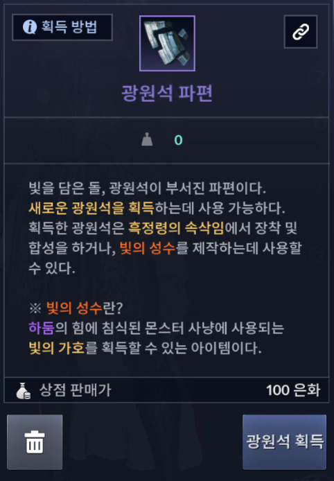 1. 고대 유적 2단계에서만 얻을수 있다. 2. 태고급 광원석을 강화하는데에 쓰이며 강화 스택에 따라 소모량이 점점 증가한다. 3. 해당 재화는 거래가 안된다. |