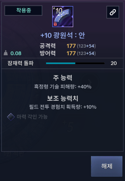 해당 광원석을 클릭 후 해제를 누르게 되면