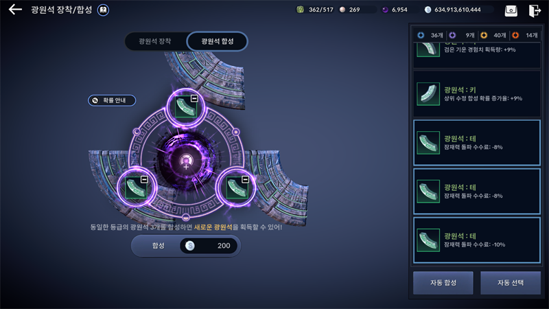 광원석 합성은 안, 테, 키, 테에 상관없이 동일등급의 광원석 세개를 합성해서 일정 확률로 상위등급으로 만들어버릴 수가 있습니다.