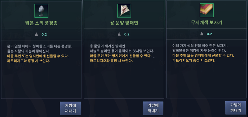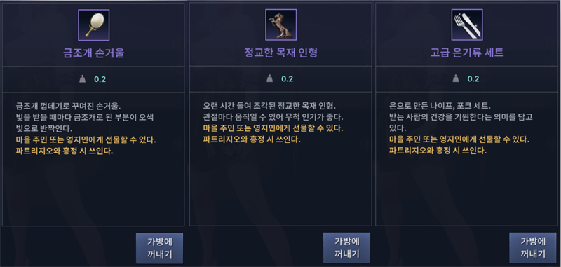 그렇기 때문에 선물은 기본 중의 기본 재화 중 하나이므로 이 재화들을 잘 활용해보시기 바랍니다.