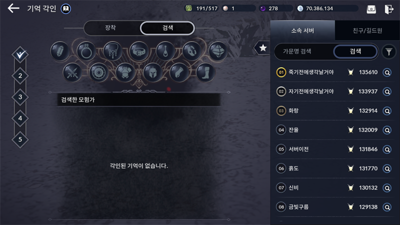 기억각인에서 오른쪽의 검색 탭으로 탭을 옮기면 이렇게 각 서버의 최상위권 유저들의 전투력이 뜨는데요. 여기서 오른쪽 깔때기 모양 필터 버튼 눌러서