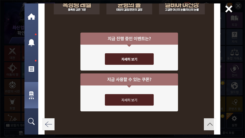 A2. 쿠폰 목록의 경우 메뉴-왼쪽 아래의 모험가 가이드를 통해서 쿠폰 정보를 받아보실 수 있습니다.