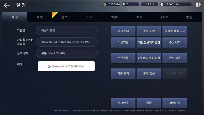 쿠폰을 등록하시기 위해서는 메뉴-설정으로 가셔서 첫 화면에 보시면 가운데쯤에 쿠폰 등록이라는 버튼이 보이는데요. 해당 버튼에서 아까 복사하셨던 쿠폰 번호를 입력하시면 우편으로 보상이 들어옵니다.