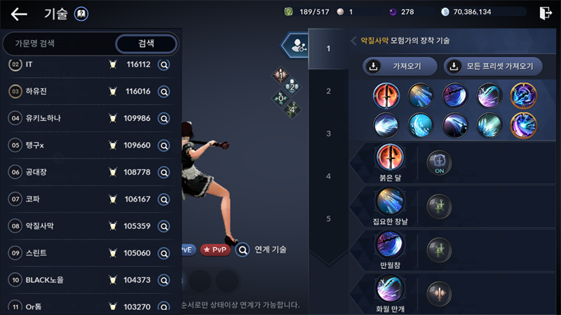 스킬 세팅 화면에서 기술성장 아이콘 왼쪽의 사람 모양 아이콘이 있는데요. 이 버튼이 해당 서버 상위권 유저들의 스킬트리를 검색할 수 있는 아이콘입니다.