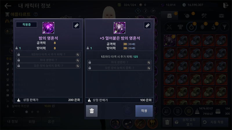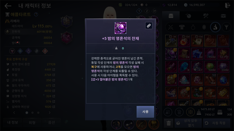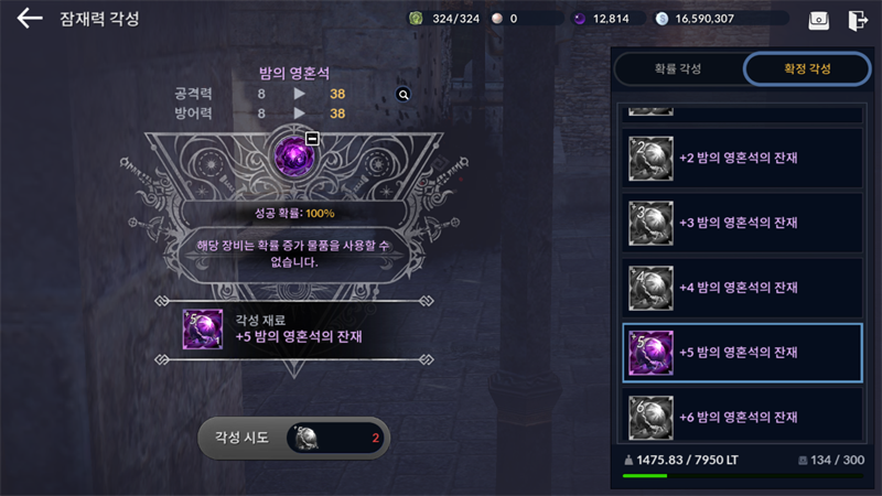 강화는 흑정령-잠재력 각성에서 이루어지는데요. 강화를 하기 위해서는 조각난 밤의 영혼석(달의 영혼석)이라는 재료 아이템이 필요합니다.