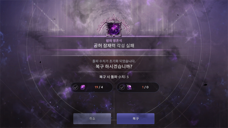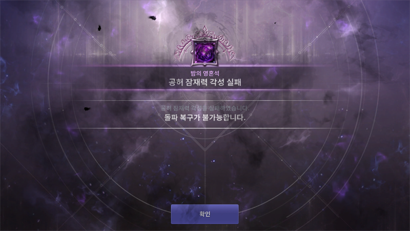 여담으로 0강 상태에서 강화에 실패할 경우, '복구가 불가능합니다'라는 메시지와 함께 어떠한 옵션도 뜨지 않습니다. 다른 패널티는 없고, 내가 강화 시도에 사용한 조각난 밤의 영혼석 1개가 날라갔다 라고 보시면 됩니다.
