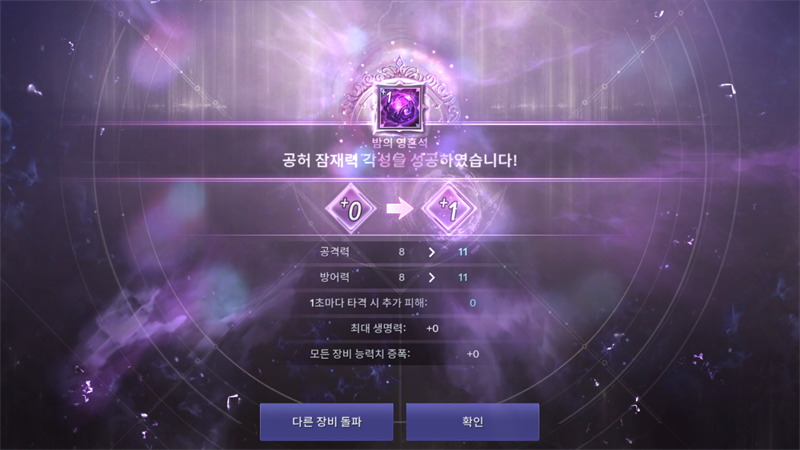 강화에 실패하게 되면 해당 영혼석 본체는 0강이 되어 초기 상태로 되돌아가고, 총 3가지의 옵션이 주어집니다.