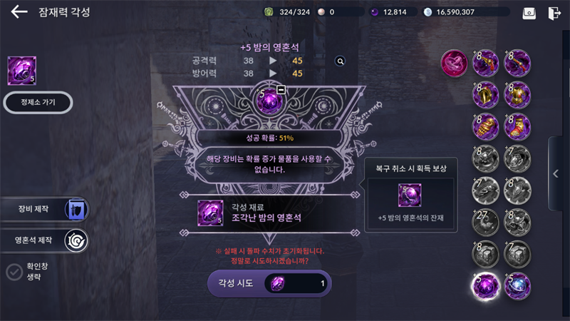 그래서 저는 현재 영혼석 스펙업은 아예 11강 상태에서 멈춰두고, 적당한 단계에서 영혼석 복구 취소를 하는 것과, 낮은 단계의 잔재를 사용해 상위 강화단계 잔재 획득을 트라이하는 것을 반복해 12까지 가기 위한 각 단계별 잔재들을 만들어내는 데에 중점을 두고 있습니다.