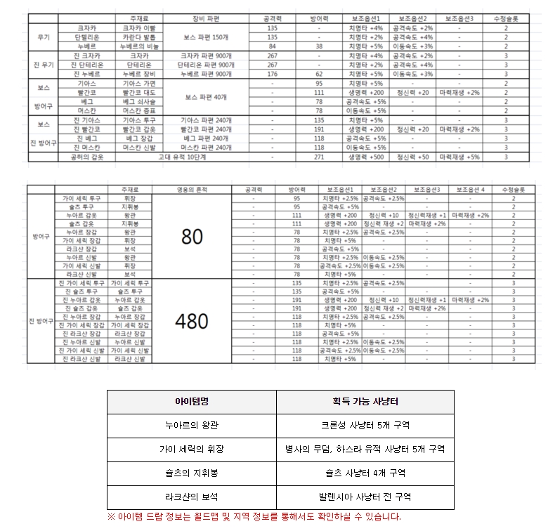 [알티노바] 보스&심연 장비 제작 재료 갯수 및 장비 능력치
