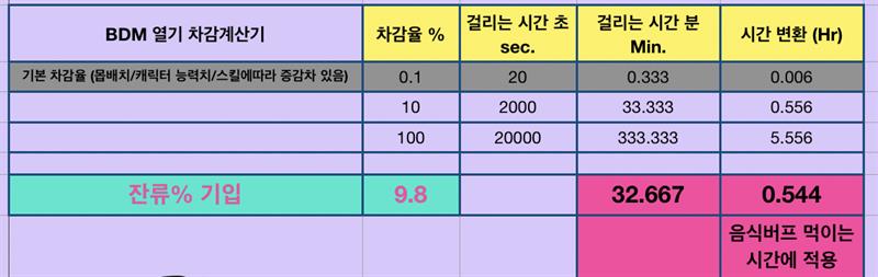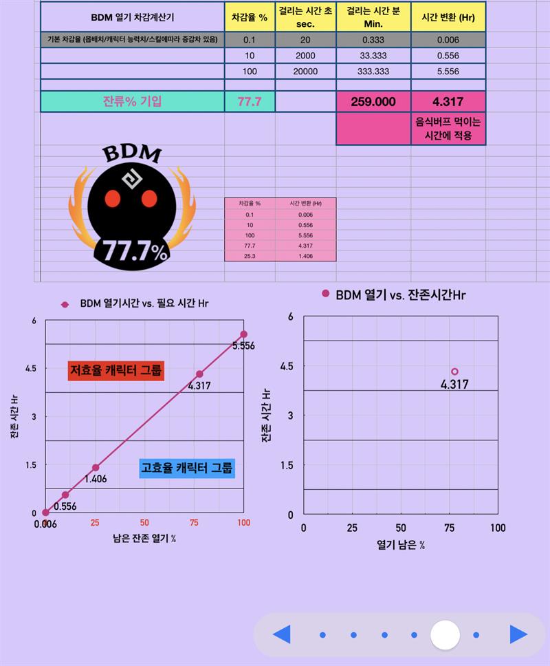음식버프 먹여야 하는 시간까지 그래프로도 보여져 좋은듯합니다. (캐릭터직업/투력/스킬장착/수정/마녀어깨 등 경우 회색 란 차감율 1개만 맞춰 변경 하면 모든게 자동 변경)