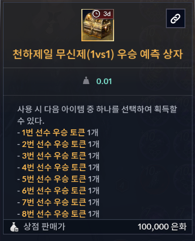 - 무신제 대회(1vs1, 2vs2) 결과 예측에 모두 성공하면, 분홍색의 '족집게' 칭호를 추가로 지급해 드립니다.