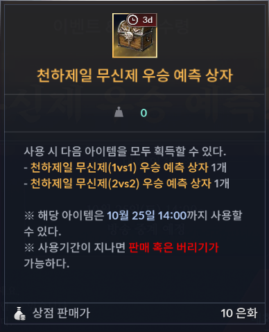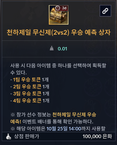 - 우승 예측 상자는 10/25(토) 14:00까지 사용할 수 있습니다.