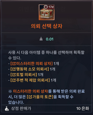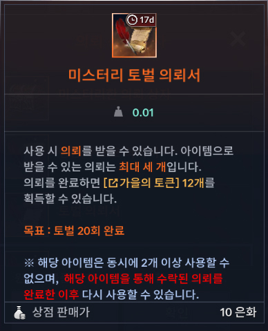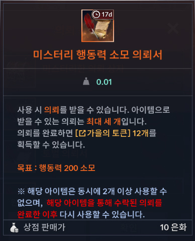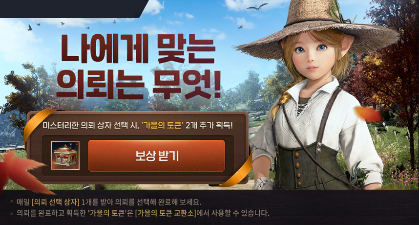 - '미스터리한 의뢰 상자' 의뢰 완료 시, 선택 의뢰 보상보다 2개 많은 '가을의 토큰' 12개를 획득하실 수 있습니다.