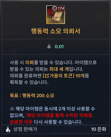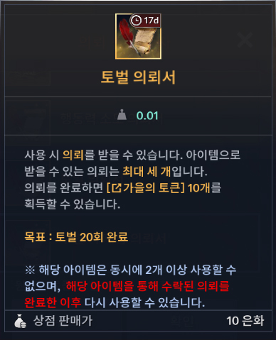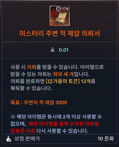 - '행동력 소모 의뢰서', '토벌 의뢰서', '주변 적 제압 의뢰서'를 선택 시, 선택하신 의뢰를 완료하고 '가을의 토큰' 10개를 획득할 수 있습니다.