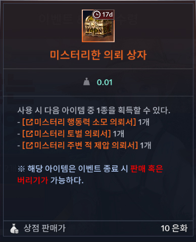 - '미스터리한 의뢰 상자' 선택 시, 의뢰를 선택할 수 없으며 상자 개봉 시 3가지 의뢰 중 무작위로 획득됩니다.
