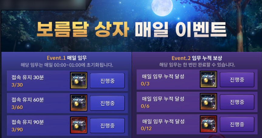 매일 임무, 임무 누적 보상을 통해 보름달 상자를 획득할 수 있습니다.
