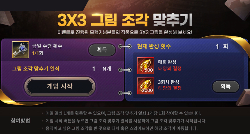 3X3 퍼즐을 맞추고 태양의 결정을 획득해 보세요!