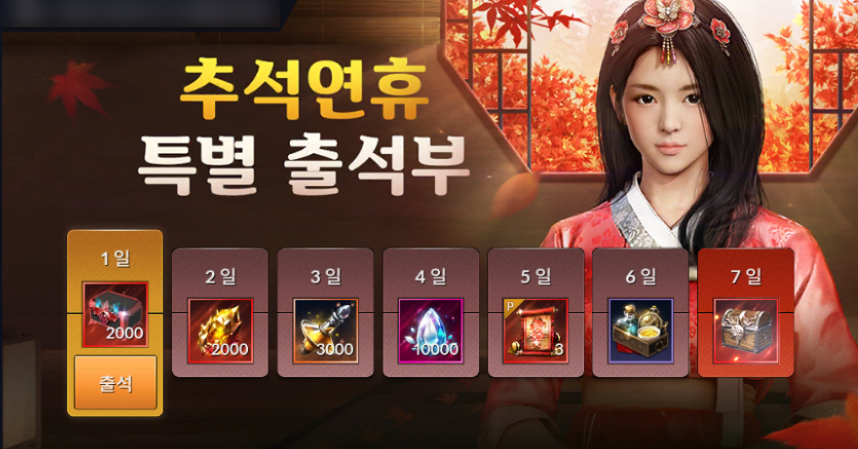 추석 연휴 동안 성장에 필요한 아이템을 획득할 수 있는 특별 출석부가 찾아옵니다!