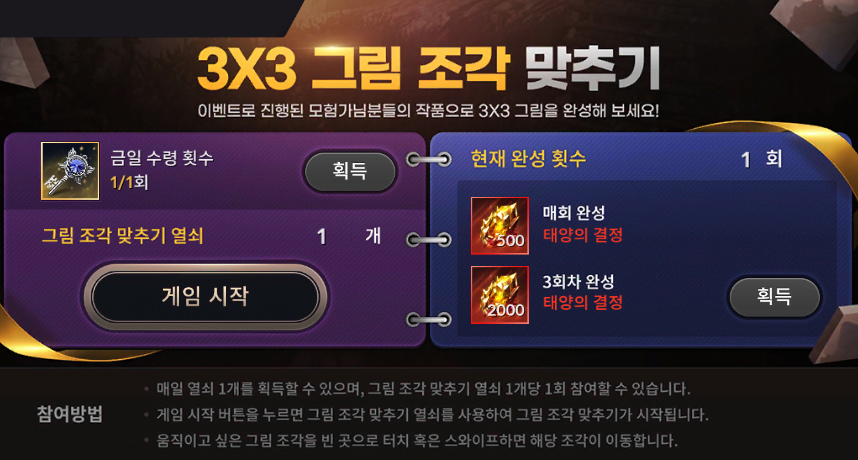 - ‘게임 시작’ 버튼을 누르면 그림 조각 맞추기 열쇠 1개를 사용해 3X3 그림 조각 맞추기를 시작할 수 있습니다.