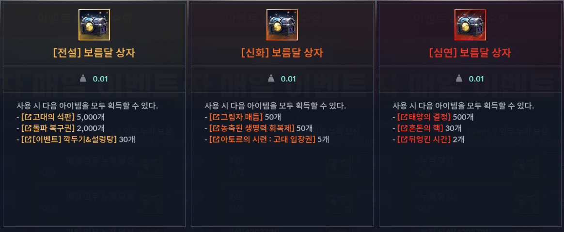 매일 임무 3회 완료 | [전설] 보름달 상자 2개 |