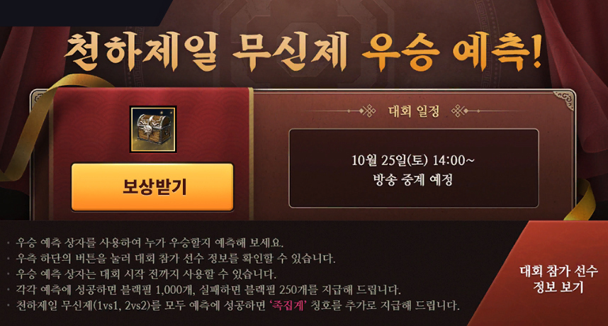 '천하제일 무신제 예측 상자'를 사용해 우승 선수를 예측해 보세요!