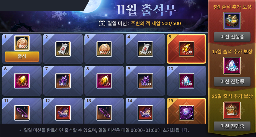 - 일일 미션을 완료하면 출석할 수 있으며, 일일 미션은 매일 00:00~01:00에 초기화됩니다.
