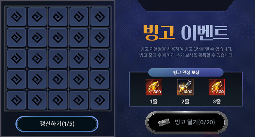 - 빙고를 1~3줄 완성할 때 빙고 줄 완성 보상을 획득할 수 있으며, 빙고 줄 완성 보상은 빙고 판을 갱신할 때마다 무작위로 정해집니다.