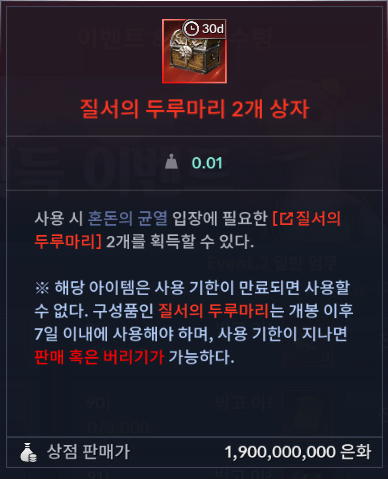 * '질서의 두루마리 2개 상자'는 획득 시 30일의 유효 기간이 설정됩니다. 개봉 시 획득하는 '질서의 두루마리'는 7일의 유효 기간이 설정됩니다.