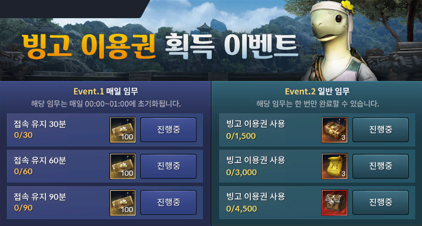 | 접속 유지 30분 | 빙고 이용권 100개 |