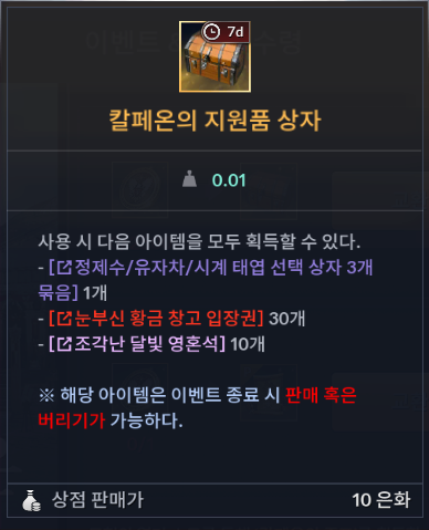- '칼페온의 증표' 2500개로 '칼페온의 지원품 상자'를 교환하고, 남은 '칼페온의 증표'는 개당 '황금 창고 입장권' 1개로 제한 없이 교환할 수 있습니다.