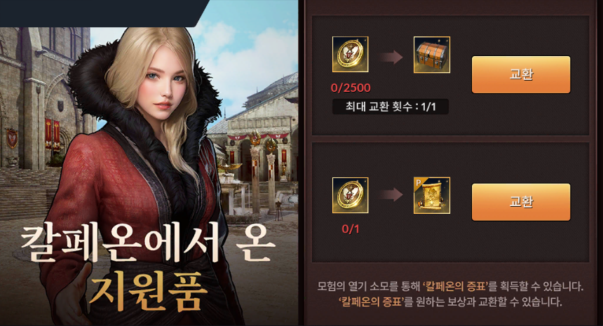 해당 증표를 ‘칼페온의 지원품 상자’로 교환하여 모험에 필요한 아이템을 획득해 보세요.