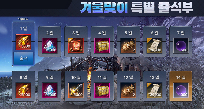 - 출석 버튼을 눌러 매일 보상을 획득할 수 있습니다.