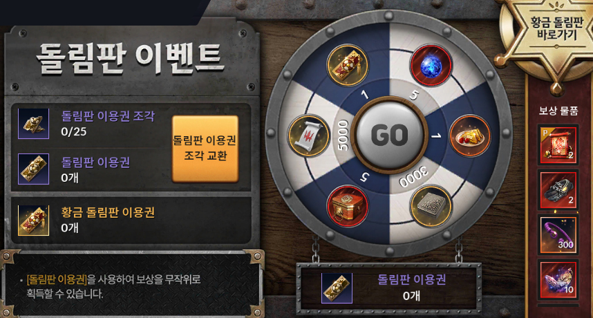 - '돌림판 이용권 조각' 25개를 '돌림판 이용권' 1개와 교환할 수 있습니다.