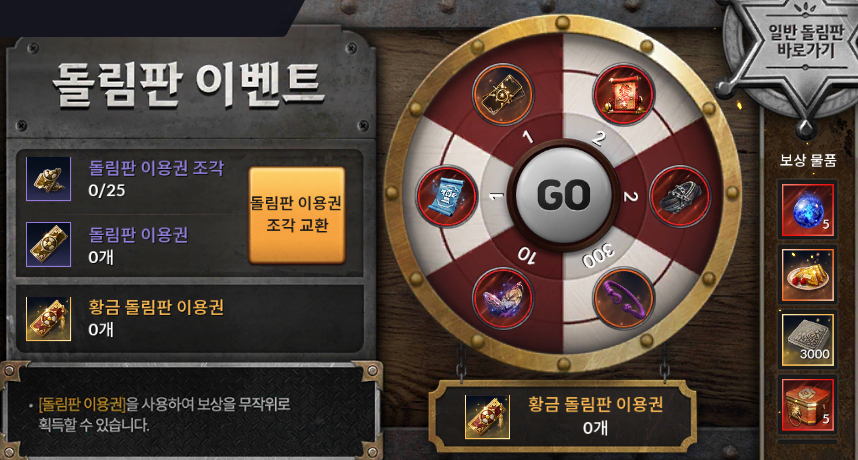 - GO 버튼을 누른 후 총 모양의 아이콘을 누르면 '돌림판 이용권'이 소모되며 보상을 무작위로 획득할 수 있습니다.