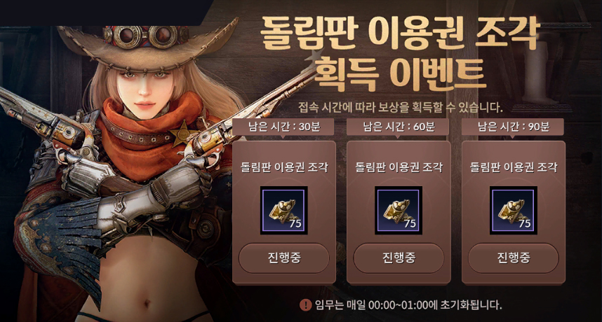 | 누적 접속 60분 | 돌림판 이용권 조각 75개 |