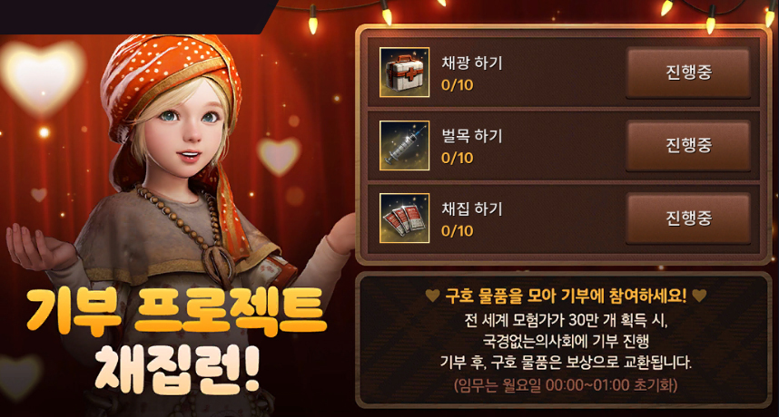 올해도 도움이 필요한 분들에게 모험가분들의 따듯한 마음을 전달하기 위해 기부 이벤트를 진행합니다.